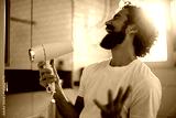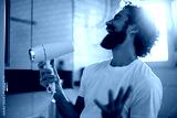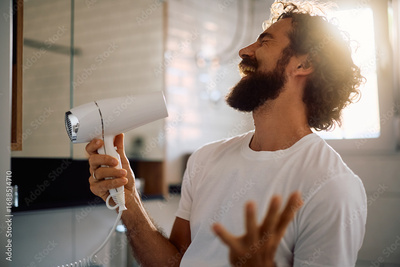 Playful man having fun while blow drying his hair in bathroom.