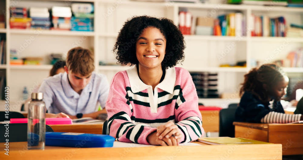 Girl, teenager and portrait in classroom with smile, information and excited for education at high school. Pupil, pride and happy for development, scholarship and learning with course at academy
