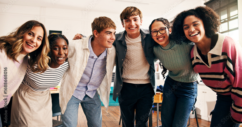 Group, education and people in classroom with smile, diversity for social media at school. Happy, portrait and teenagers with learning, collaboration and opportunity in studying for scholarship.