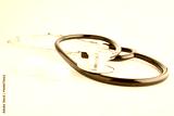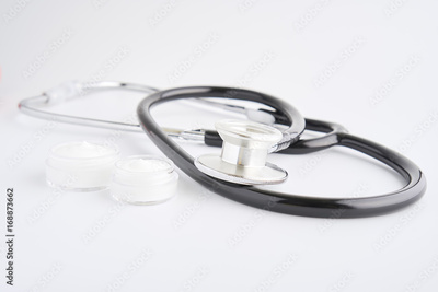 stethoscope and cream bowls placed on a white table.Health and hygiene concepts.