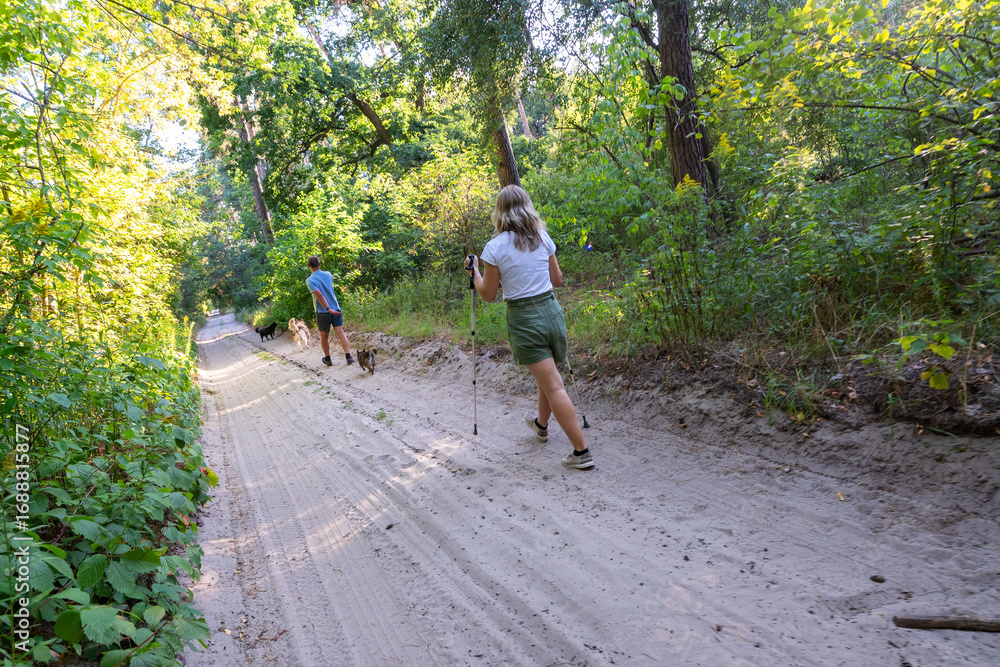 Couple with dogs nordic walking and hiking on a sunny forest path. Healthy outdoor activity, pet companionship, and nature exploration.