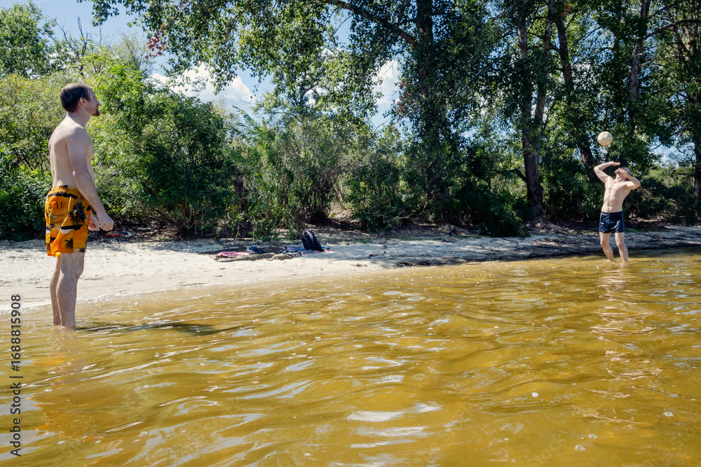 Friends enjoy a sunny summer day playing volleyball in shallow water near a sandy riverbank surrounded by green trees. Leisurely outdoor activity and fun on vacation.