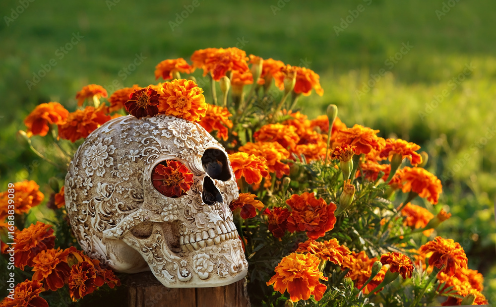 Decorative human skull and bright marigold flowers in garden, nature background. cempasuchil flowers - symbol of Mexico's Day of the Dead, dia de los Muertos. spiritual ritual for Samhain. copy space