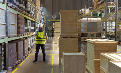 Warehouse logistics, worker in safety vest with hard hat using walkie-talkie among shelves with crates, pallets and containers, storage management, supply chain