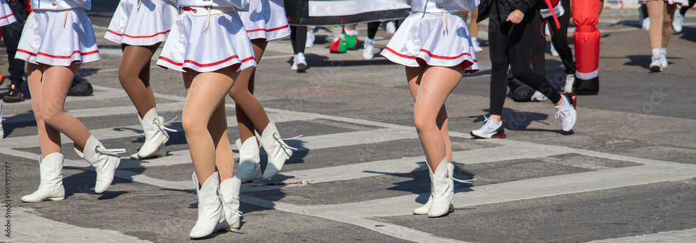 Panorama view performers in white skirts and red-accented uniforms march alongside other parade participants in red costumes, casual attire. Banner highlights group diversity unity in Dallas, TX