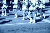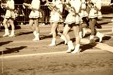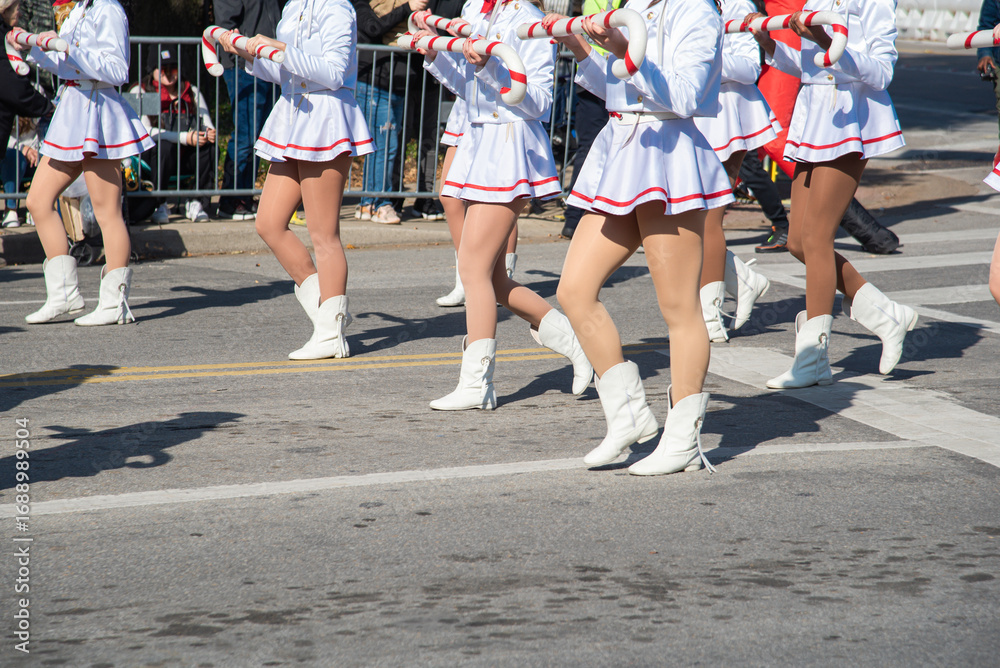 Line of baton twirlers in white skirts, long socks, white boots perform sync during holiday parade in Dallas, Texas. Red-striped batons, festive attire reflect seasonal cheer, public celebration