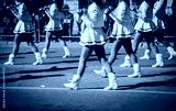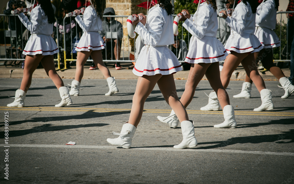Blurry spectators in camping chair behind steel barricades watching young performers in white uniforms, red hats carry giant candy cane during holiday parade, Dallas, Texas. Festive urban setting