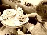 Top view of man eating sandwich with potato wedges at cafe table. Lifestyle, routine, and food consumption in hospitality environments.