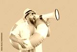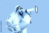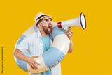 Funny man in sunglasses, sun hat and beach ring standing isolated on yellow background, holding megaphone voice volume amplifier, and making loud announcement. Summer vacation, holiday sale concept