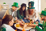 Happy smiling young people friends men and women wearing funny green hats celebrating Saint Patrick's Day eating pizza and drinking beer together in the living room at home. People party concept.