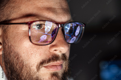 Male medical professional with glasses examines computer tomography images reflected in lenses, showcasing advanced imaging technology and the importance of diagnostics in healthcare