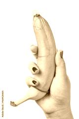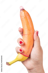Woman holding banana with condom isolated on white background. Masturbation Man Penis Erection Condom Satisfaction Sex Woman Hand Concept