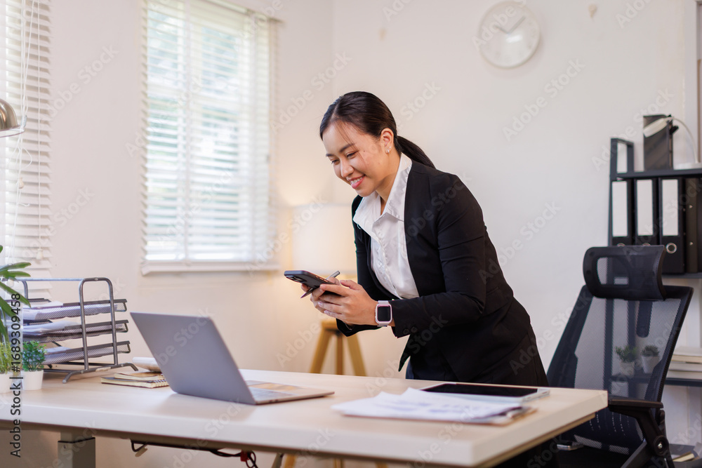 Stylish smiling face happy asian business woman manager working on laptop while sitting in office. financial report, business plan investment, finance analysis concept. High quality photo