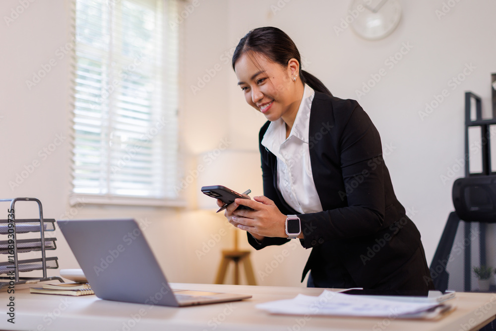 Stylish smiling face happy asian business woman manager working on laptop while sitting in office. financial report, business plan investment, finance analysis concept. High quality photo