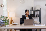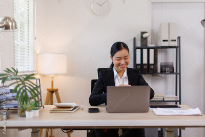 Portrait of laughing business asian woman sitting at desk in the office, financial report, business plan investment, finance analysis concept.