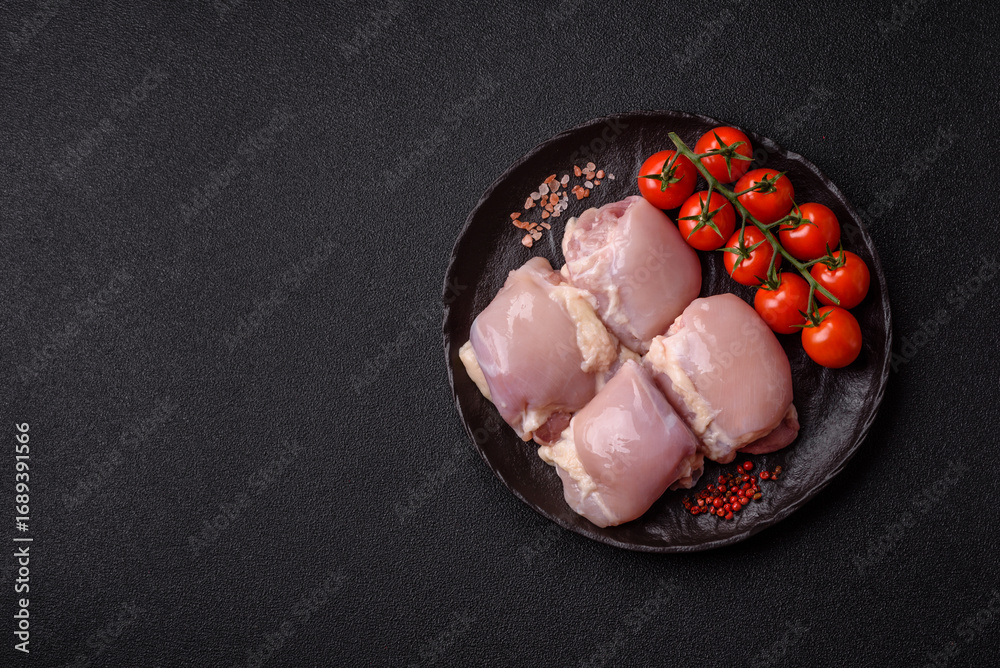Chicken or turkey raw thigh fillet, skinless and boneless poultry meat. Chicken thigh fillet