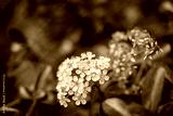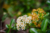 A detailed macro photograph capturing a cluster of small white flowers in full bloom. The blossoms, each with delicate white petals and yellow stamens, stand out beautifully against a green background