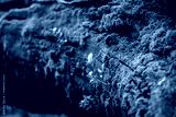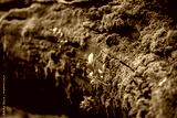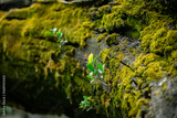 Green moss covers the bark of a fallen tree, with fresh leaves sprouting from the cracks, highlighting forest regeneration.