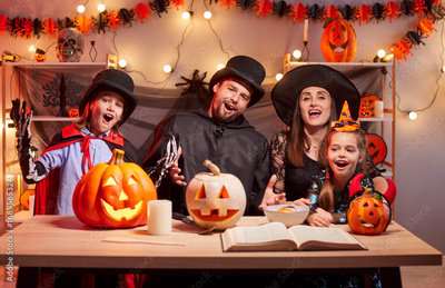 Portrait of excited happy young family of mother, father and children wearing masquerade costumes celebrating Halloween party at home sitting at festive table with pumpkins decorations
