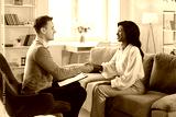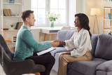 Happy young African American woman patient shaking hands with professional psychotherapist or psychologist, thanking him for help and support. Psychotherapy, counseling therapy concept