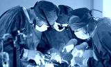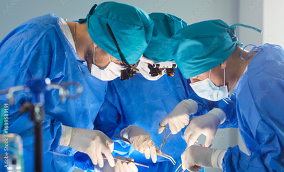 Team of professional surgeons leaning over patient during operation in surgical room. Focused medical specialists in blue scrubs and masks using surgical instruments, working together during surgery.