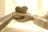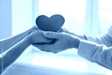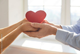 Two pairs of hands gently holding red paper heart together. Symbol of love, care, romance, charity, support and kindness representing emotional connection between people in meaningful warm gesture.