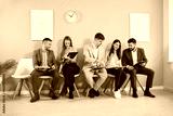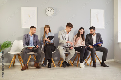 Group of business people sitting on chairs with clipboards, chatting and checking papers. Smiling professionals preparing for interview or business meeting, sharing thoughts and reviewing resumes.