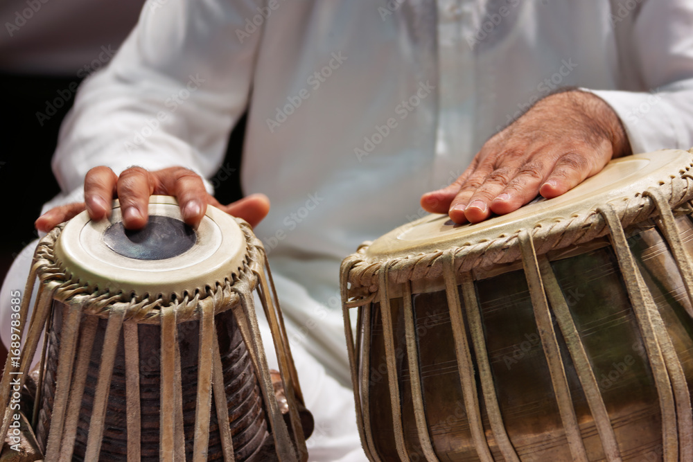 Hindustani Classical Music, indian tabla drums percussion instrument, close up on hands