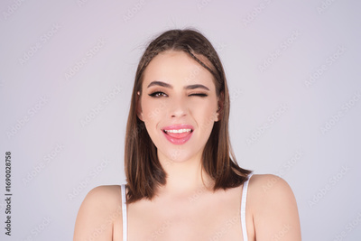 Lovely girl winking eye on isolated background. Young woman winking and looking at the camera with expression. Fun face. Portrait of pretty girl wink. Woman blinking. Wink and blink. Expressive eyes.