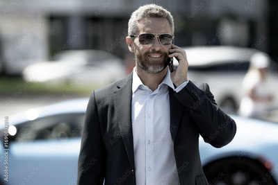 Mature businessman. Rich business man enjoying success. Luxury business. Rich man front of expensive car. Luxury business travel. Confident rich businessman in a classic suit.