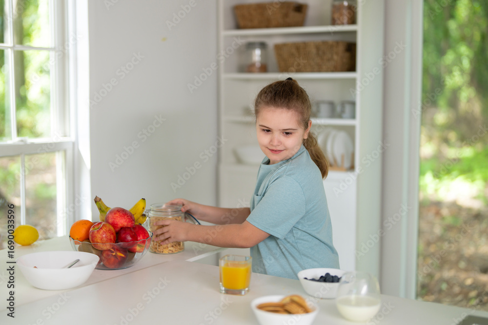 Kid eating healthy lunch in white kitchen. Happy kid enjoying fresh fruits for lunch in modern kitchen. Cute kid eating vegetarian lunch in home kitchen. Kid having tasty homemade lunch in kitchen.