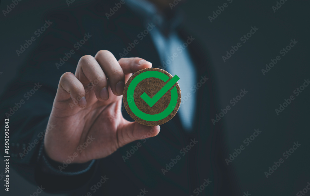 Businessman holding wooden round badge with green check mark symbol representing approval certification validation quality assurance success, business decision and verified acceptance.