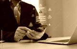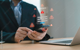 Businessman holding smartphone facing online payment error alert warning of credit card fraud cyber security risk and financial transaction failure in digital banking system.