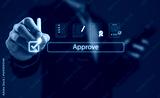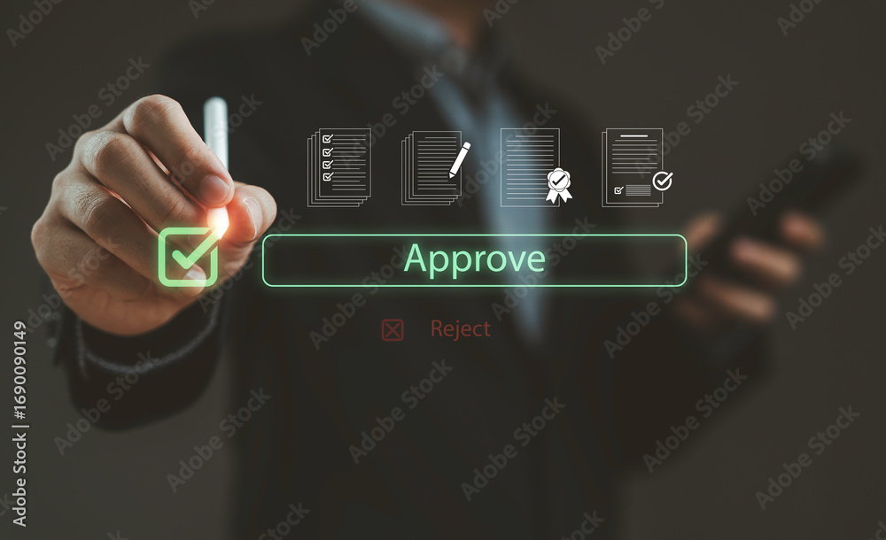 Businessman pressing digital approve button with check mark, symbolizing online agreement contract approval certification business decision document verification and successful authorization.