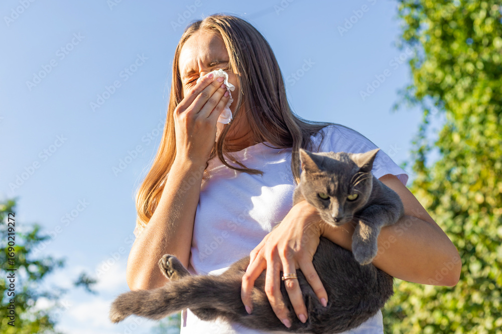 Woman holding a cat. Woman is allergic to cats. Allergy to cat fur.