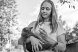 Woman holding a cat. Woman is allergic to cats. Allergy to cat fur.