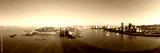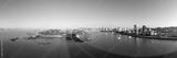 Coastal island panorama shows ocean and city skyline under a clear blue sky.