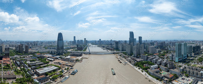 An expansive city skyline featuring tall buildings and a wide river shows the urban landscape of Ningbo, China under a bright sky.