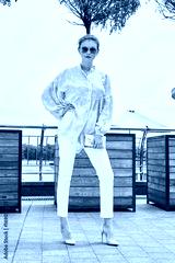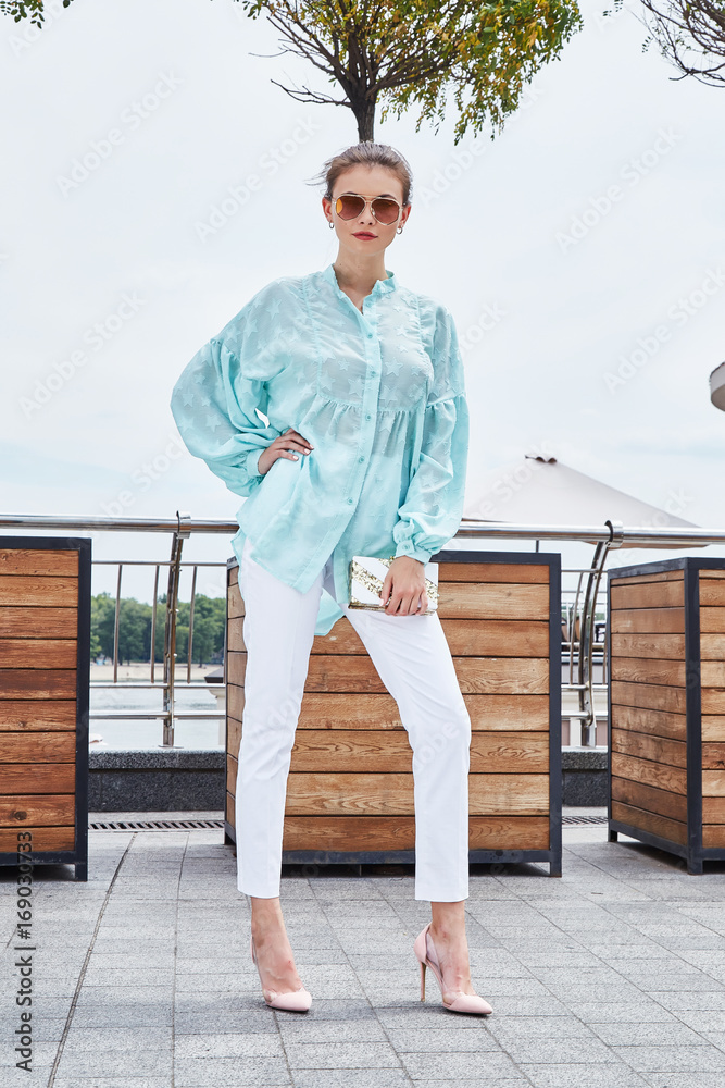 Fashion model brunette woman sexy pretty lady summer mood wear blue blouse white jeans casual collection of clothes street look walk date romantic city perfect beautiful face accessory bag sunglasses.