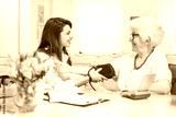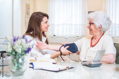 Nurse measuring blood pressure of senior woman at home.