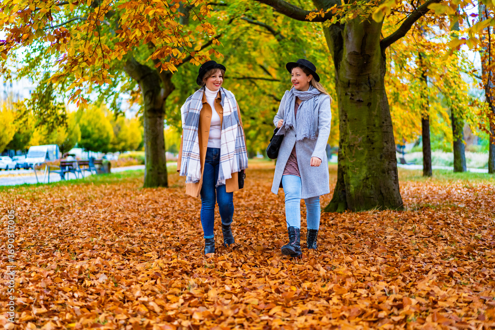 Autumn in city. Two beautiful mature women in brimmed hats walking in city park on autumn day. Front view