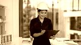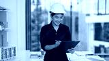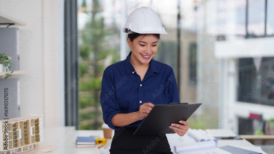 Asian woman architect reviews building plans design blueprint at modern office work professional construction project development site management design studio