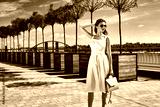 Beautiful woman walk on the street square wear fashion style clothes white cotton dress accessory bag jewelry sunglasses alley avenue romantic date summer sun city young lady elegant clothes style.