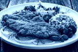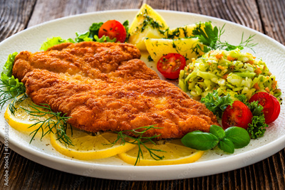 Crispy breaded chicken cutlets with boiled potatoes and young cabbage salad on wooden table