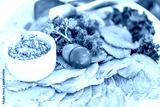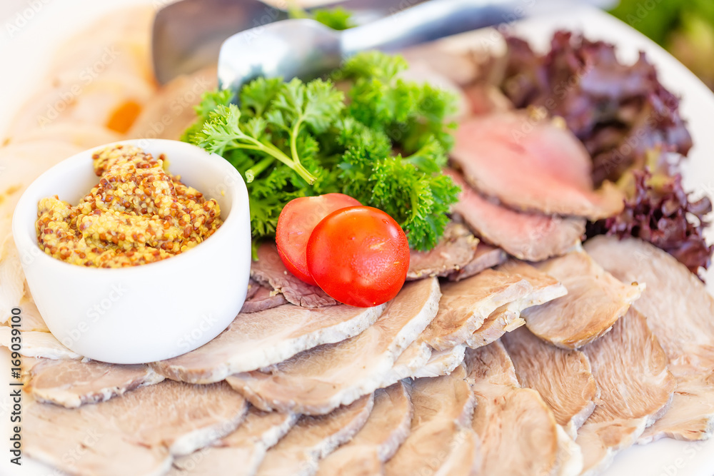 Meat plate with delicious pieces of sliced ham, sausage, meat, tomatoes, parskey with herbs and spoon. Close up with selective focus.