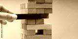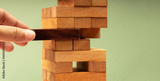 hand pulls a block from stack of Jenga tower. Emergency funds and money, business risk management