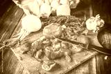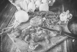 Omelette preparation with cut tomatoes, dill, onion, eggs and knife. Toned image.