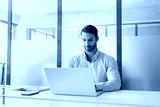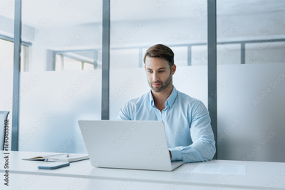 Young professional specialist latin hispanic business man working on laptop pc sitting at desk in modern office space. European businessman entrepreneur using computer technology app for work online