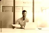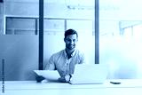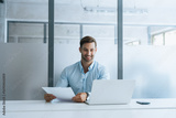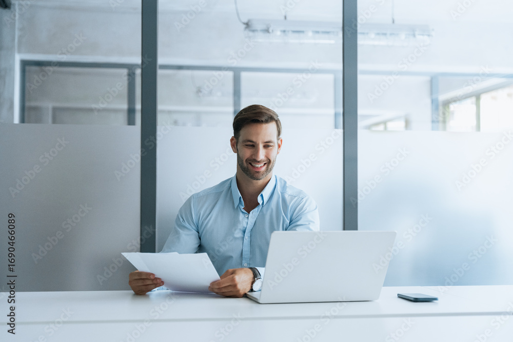 Smiling latin business man salesman working on laptop computer reading financial contract document in office workplace. Young manager businessman specialist doing paperwork analysing on pc. Copy space