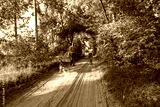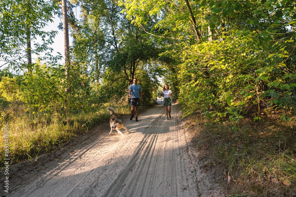 A happy couple and their husky dog enjoy Nordic walking on a sunny forest path, embodying an active, healthy lifestyle and outdoor adventure. Perfect for themes of wellness, nature, and pet-friendly t